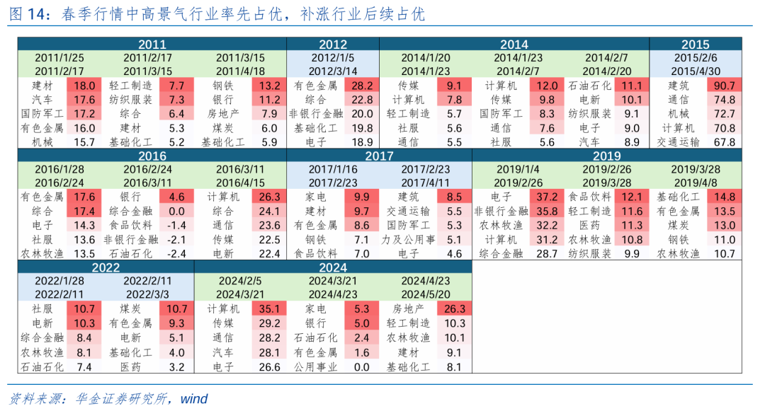 春季行情中高景气行业率先启动,后期补涨行业相对占优。咱们将春季行情开启较后年份中按照指数节拍分袂时候,分别将不同期期涨幅前5的行业列开拔现:(1)春季行情前期高景气率先启动,如2011受益于商品房销售增速达约27.4%傍边的建筑讳饰、机械开辟;2014年受益于互联网周期重迭3G推动传媒、贪图机率先走强;2016、2017受益于供给侧改变下产能出清盈利优化的有色金属、建筑建材等行业率先走强、2019年受益于半导体上行周期下的电子、贪图机走强, 2022年受益于新能源趋势下的电新走强, 2024年受益于AI周期开启下的贪图机、传媒、通讯走强。(2)春季行情后期,补涨行业相对占优,如2011年受益城镇化下原料价钱上升的轻工、钢铁、家用电器,2014年受益于减产条约下供给收缩的石油石化,2016年受益物联网、云贪图等带动第三轮半导体上行周期下走强的贪图机、通讯、传媒,2019.12受益于外资流入及保增长计谋下走强的食物饮料、纺织服装以及新能源趋势下工业金属需求回升、库存下降的基础化工、有色金属,2022受益于地缘冲突下供给收缩减产及经济树立预期下的煤炭、有色金属、基础化工,2024年受益于财政计谋及内需提振计谋发力下走强的家电、供给收缩下走强的有色金属、及地产计谋平缓下的地产。