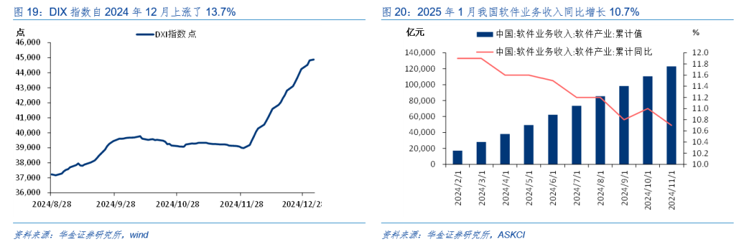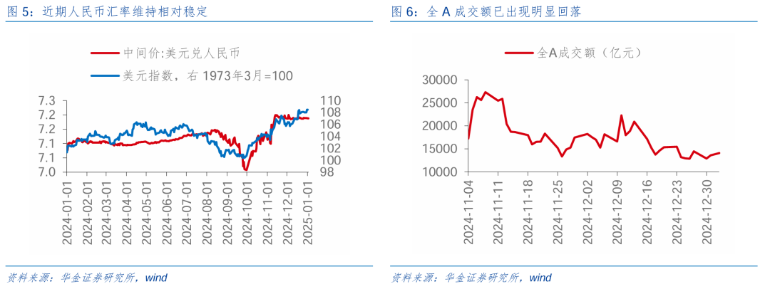 短期转机后市集厚谊可能企稳。(1)特朗普上台后可能加征关税、好意思联储1月暂停降息等外洋身分对市集厚谊可能有扰动。一是特朗普再度上任对于我国商品关税加码的预期抓续扰动市集厚谊:据Guardian预测,特朗普的贪图可能将关税提高到20世纪30年代以来的最高水平,寰球贸易垂危风物可能行将出现,但我国出口结构抓续改善,出口对象徐徐转动至欧盟、东盟、巴西、非洲等地,且内需在计谋维持下徐徐树立,对我国制造业的冲击可能远小于2018年。二是好意思联储1月暂停降息等外洋身分对市集厚谊可能有扰动:受好意思国经济数据和好意思联储偏鹰表态影响,1月暂停降息概率较大,降息节拍徐徐放缓下对风险偏好可能有一定压制。(2)降准、两会计谋预期等依然对风险偏好有维持。一是前期对货币计谋定调积极,提议当令降准降息,在岁首资金面呈季节性垂危趋势的环境下央行节前可能有降准操作,届时市集厚谊有望迎来树立。二是两会可能进一步积极蔓延财政、完善产业计谋:率先在前期明确财政计谋加码后,市集对于两会进一步细化财政蔓延限制和发力标的的预期大幅上升,预期两会将进一步明确财政蔓延的限制和标的,可能包括提高赤字率、加速刊行超遥远国债、加多中央对场地的转动支付等措施,以支抓经济复苏并提振市集信心;其次产业计谋上可能加速制造业升级,意想将加大对关节中枢技艺的参加,相配是在半导体、东谈主工智能、生物医药等鸿沟,计谋加速落实以推动制造业数字化和智能化转型,支抓高端制造业发展。