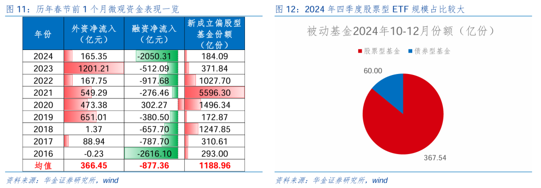 市集厚谊回落导致融资有所流出,但岁首融资、外资等资金可能季节性回流。(1)1月微不雅资金有望跟着春季行情开启树立。一是新发基金来看,本周新成立偏股型基金份额共99.34亿份(前值为150.7亿份),受元旦假期影响新发基金份额小幅下降,但从2024Q4被迫型基金的刊行限制来看,超简略均为股票型ETF,中遥远资金加大流入力度下新发基金份额可能络续回升。二是受近期市集厚谊有所回落、节前避险厚谊上升等身分影响,本周完了1月2日融资净流出193亿元(前值为-86.3亿),后续可能跟着春季行情开启徐徐树立。(2)季节效应来看,外资和新发基金大概率络续流入。一是统计2016年以来积年春节前1个月微不雅资金的净流入情况来看,融资在节前多流出,外资在春节前多保抓净流入;外资、融资、新发基金春节前1个月净流入均值分别为366.5亿元、-877.4亿元、1189亿份。二是险资在岁首也多流入A股,2015至2024年时期的9年,保障资金(期骗在股票和证券投资)在1月和2月分别净流入5次、6次。三是跟着财政和货币计谋的徐徐落实,以及经济树立预期的普及,外资、新发基金、险资等增量资金有望在春节前络续回流,意想微不雅流动性将保抓宽松的趋势。