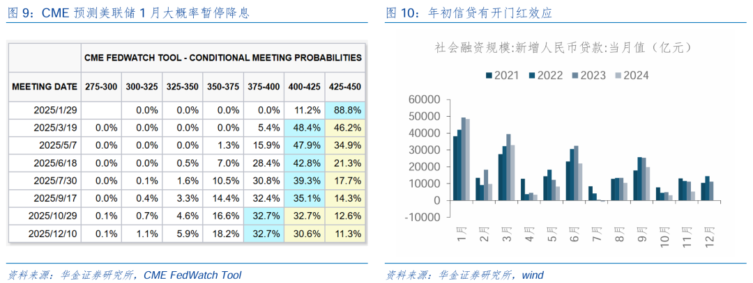 流动性督察宽松。(1)外洋方面,好意思联储1月可能暂停降息,好意思元抓续回升,但东谈主民币汇率督察相对镇静。一是受好意思联储偏鹰表态及好意思国经济数据影响,市集对于1月好意思联储暂停降息的预期昭彰上升,CME预测1月暂停降息的概率接近90%,但外洋流动性仍处于宽松周期内。二是近期好意思元指数颤动上行,但对东谈主民币汇率的压制昭彰减轻,在国内稳增长计谋抓续落地改善经济树立预期的配景下,后续东谈主民币汇率可能趋稳,外洋风险对国内宽松的制肘减轻。(2)1月事贷可能季节性回升,且春节前央行大概率实施降准。一是年底央行通过公开市集操作大幅回收流动性,12月27日回收成币超万亿,短期内资金面可能偏紧。二是岁首信贷多有开门红效应,且政府债刊行可能提前、1月交税岑岭等身分影响卑鄙动性需求较大,因此节前央行可能实施降准呵护流动性督察平稳。