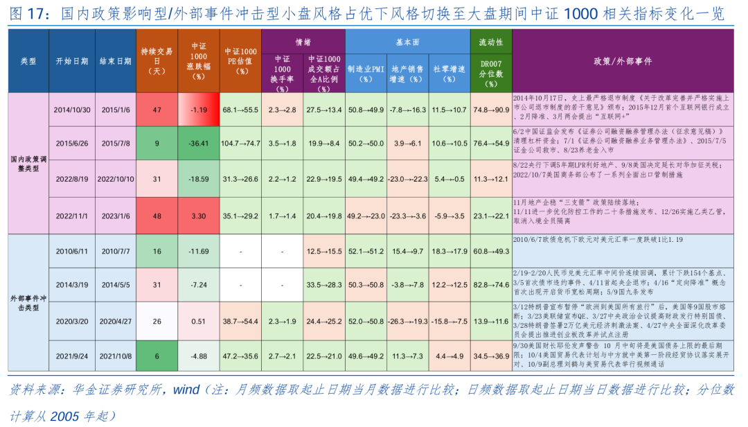 小盘派头出现短期转机主要受计谋、小盘估值和厚谊过高级身分的影响。咱们把柄诱发风作风整的原因的不同对于小盘转机期进行分类,将2014.10、2015.6、2022.8、2022.11归类为受国内计谋影响的小盘转机期,将2010.6、2014.3、2020.3、2021.9归类为受外部冲击影响的小盘转机期,不雅察宏不雅谋划总结法例发现:(1)小盘转机主要受计谋转机和外部冲击,但计谋转机或事件冲击事后小盘可能重新占优:一是受计谋影响类型小盘走弱,如2014.10受严格退市轨制《对于改变完善并严格实施上市公司退市轨制的多少意见》、2015.6受《证券公司融资融券治理办法(征求意见稿)》算帐杠杆资金、2022.8央行下调5年期LPR、2022.11央行稳地产“三支箭落地”下均推升大盘派头占优;而计谋转机后,小盘派头即重新走强,如2014.12首个互联网银行成立及“互联网+”看法兴起、2015.7证金公司救市、2022.11进一步优化防控职责的二十条措施发布下使得小盘派头纪念。二是受外部事件冲击下小盘走弱,如2010.6欧债危境下欧元对好意思元汇率一度跌破1比1.19、2014.3东谈主民币兑好意思元汇率中间价一语气回调,累计下落154个基点、2020.3特朗普秘书暂停“欧洲到好意思国所有旅行”后,好意思国等9国股市熔断、2021.9好意思国财长耶伦发声警戒 10 月中旬将是好意思国债务上限的临了期限下避险厚谊疏导市集转向大盘派头;而事件冲击事后,小盘派头即重新走强,如2014.4-2014.5央行降准重迭国九条版块后手游及互联网并购重组波澜兴起、2020.3好意思联储秘书QE同期中央政事会议提高财政刊行相配国债、2021.9好意思国贸易代表贪图与中方就中好意思第一阶段经贸条约落实张开对话蹂躏摩擦厚谊下小盘派头纪念。(2)前期估值较高、厚谊过热对小盘派头中短期转机影响也较大:8年中短期小盘转机中有5年中证1000的PE驱动估值在高位、5年换手率处于高位、6年景交额占比全A在20%傍边高位。(3)基本濒临中短期小盘转机具一定影响:8年小盘中短期转机中有7年制造业PMI、地产销售增速、社零增速均不同程度恶化,仅有2014.5、2020.4、2023.1 “小切大”时期基本面三项谋划中两项改善,基本面树立乏力下大盘派头缺少抓续走强能源。